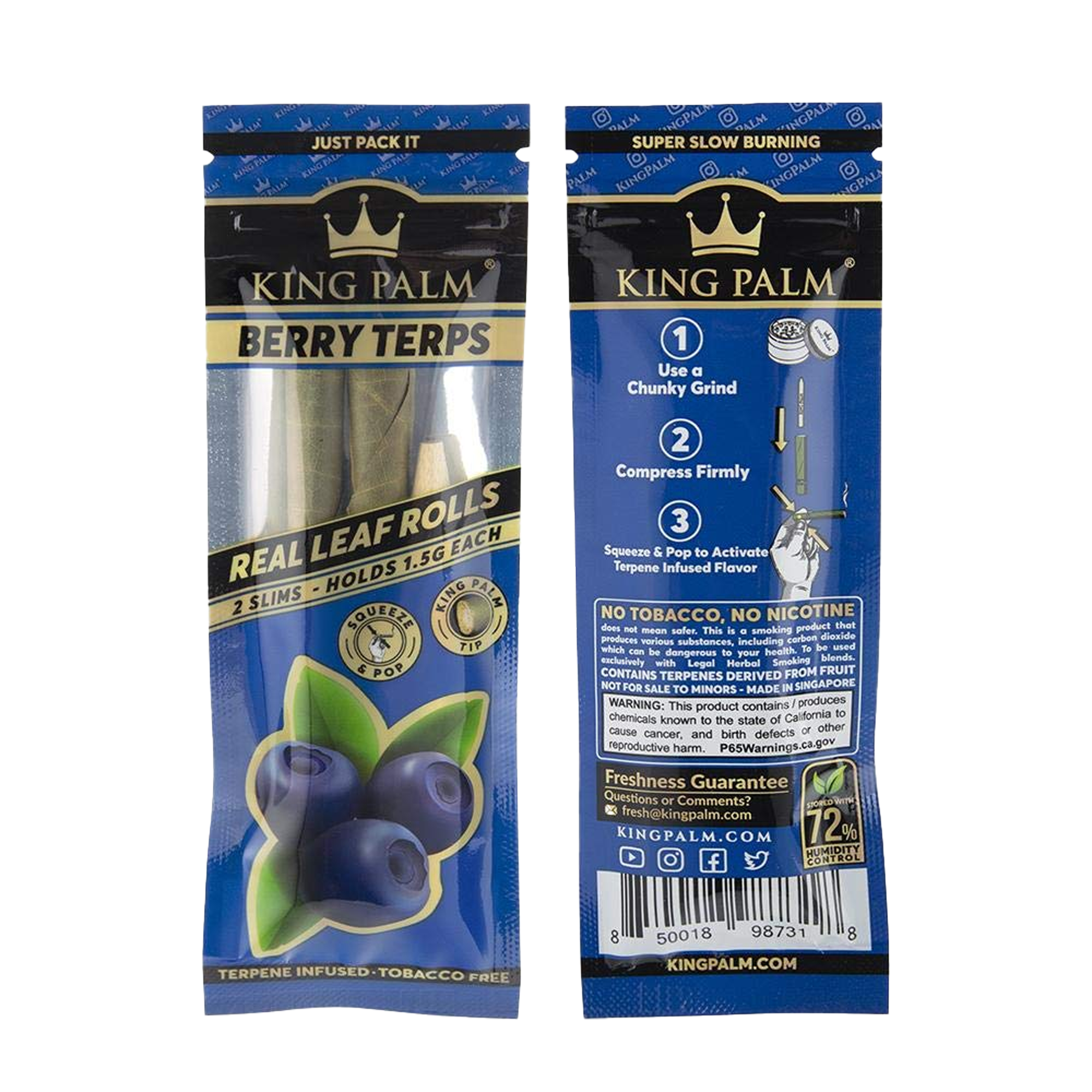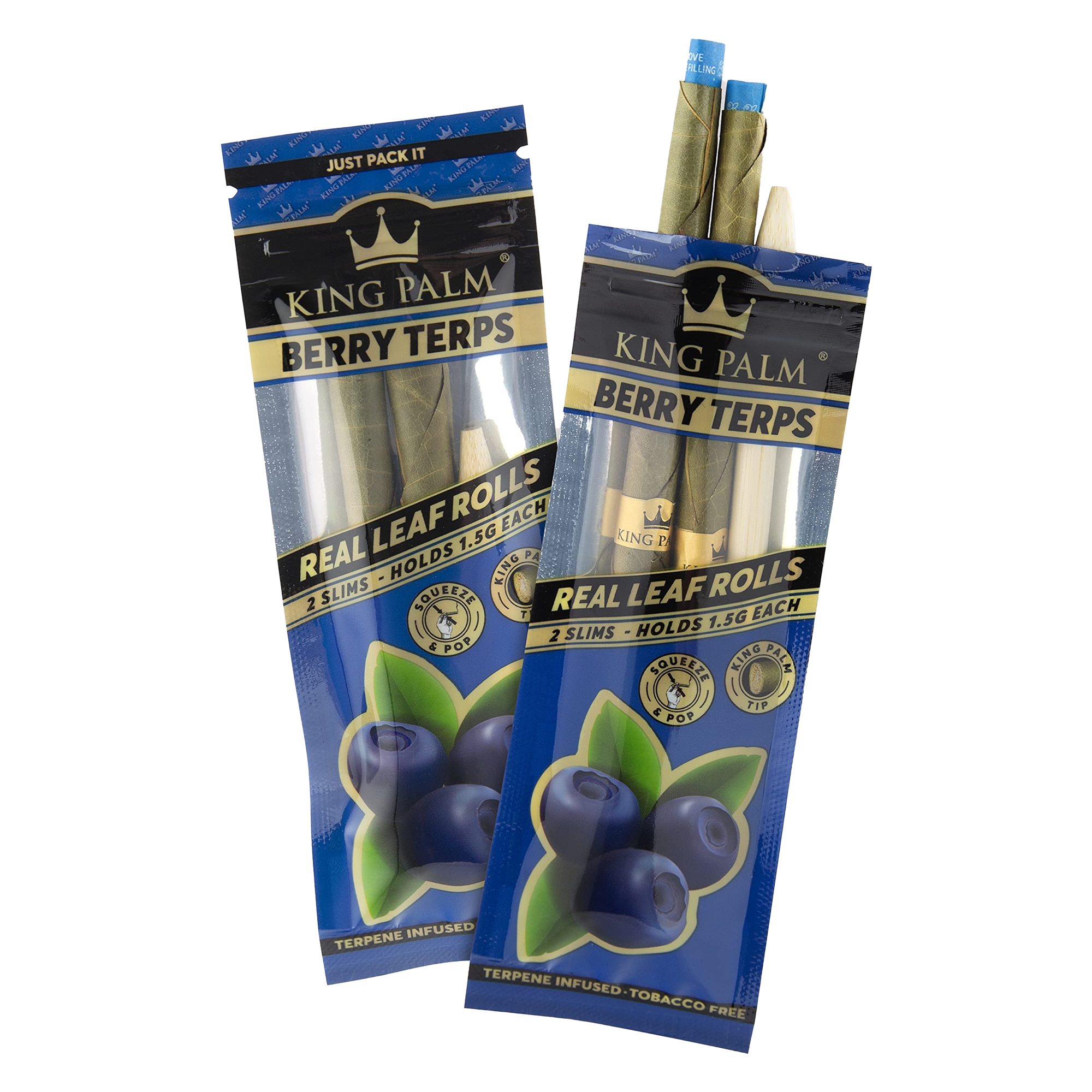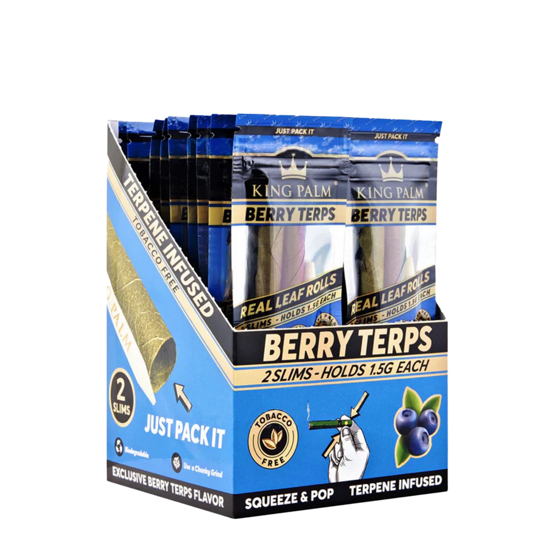When you want a smoke sesh with flavor, look no further than Berry Terps Slim blunt cones from King Palm. Completely free of tobacco, artificial flavorings, and dyes, King Palms are made from 100% slow-burning Cordia palm leaves.