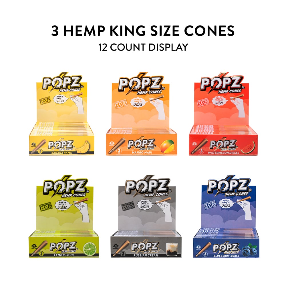 We are pleased to announce our new line of all-natural hemp cones, ready to ship to your front door now. They’re 100% all-natural and come in six different flavor options for the King Size. Each display holds 12 individual boxes with 3 King Size Hemp Cones in each box.
