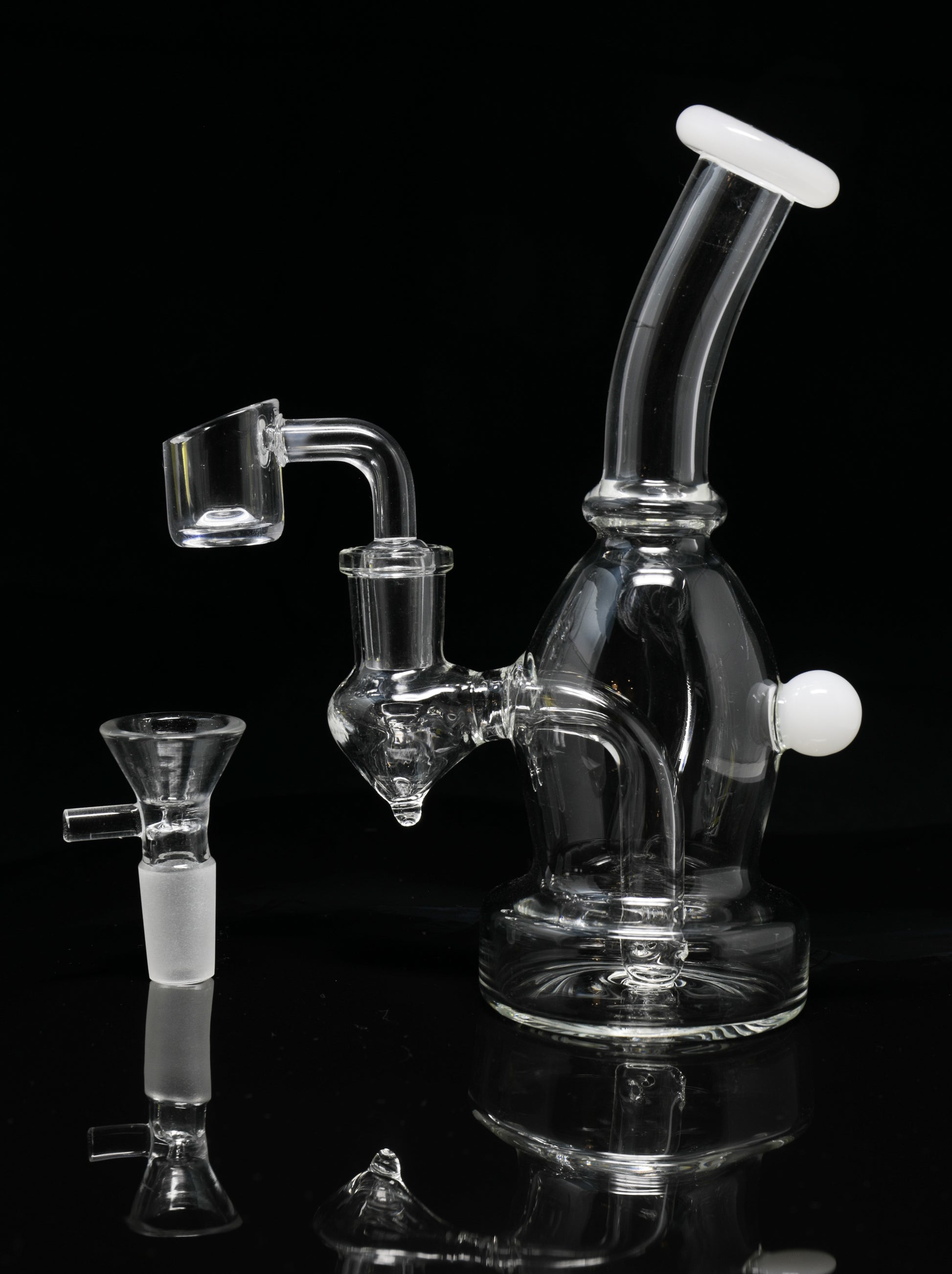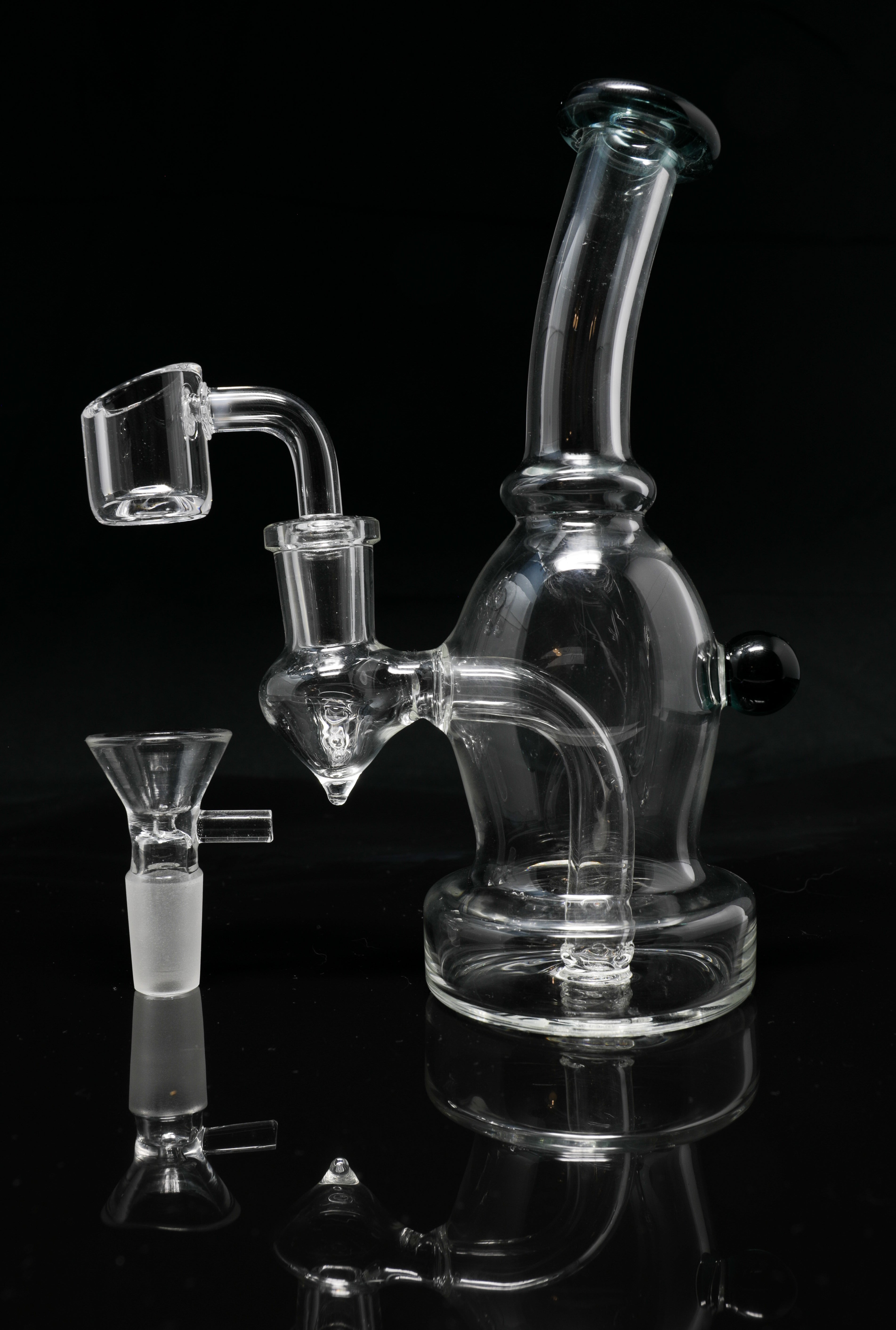 This compact inline recycler rig is built for smooth, controlled pulls and clean flavor. Designed with a curved neck and efficient recycling action, it keeps water moving while cooling vapor fast. The thick clear glass body is accented with subtle colored details on the mouthpiece and side knob, giving it a refined look without being loud.