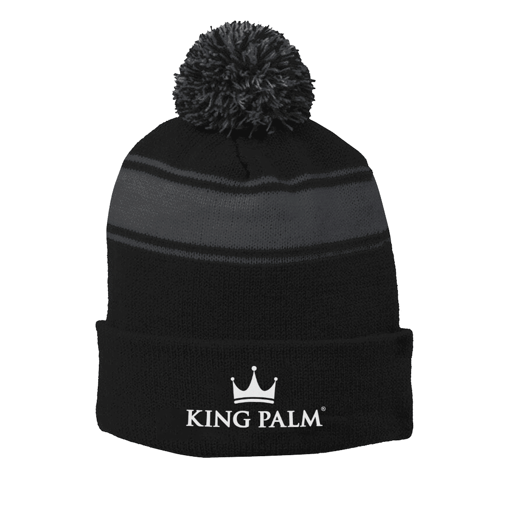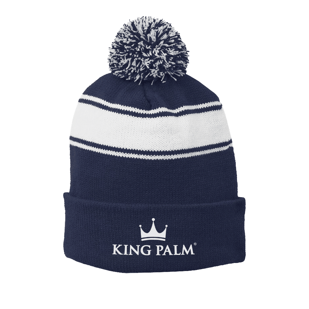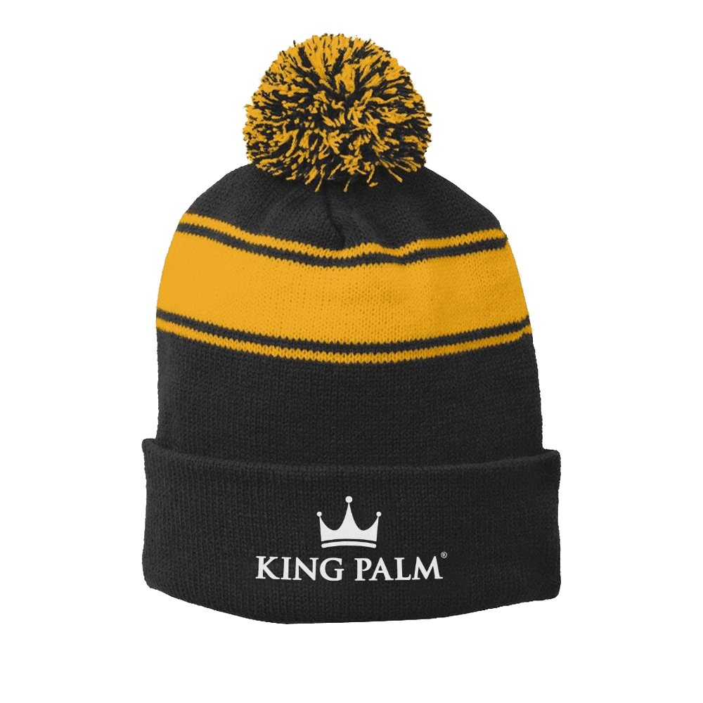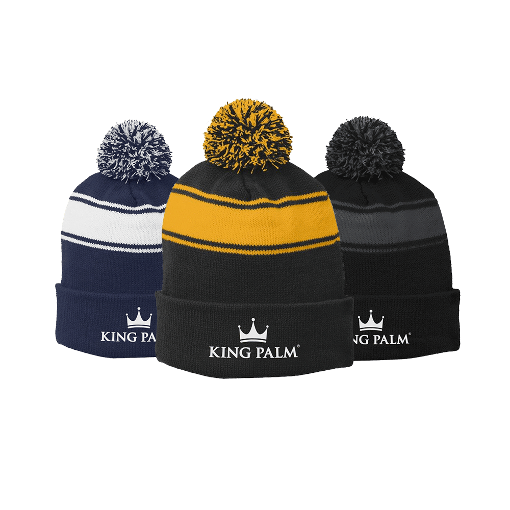 Pom Beanies in select colors: Navy/White, Black/Gold, & Black/Iron Gray