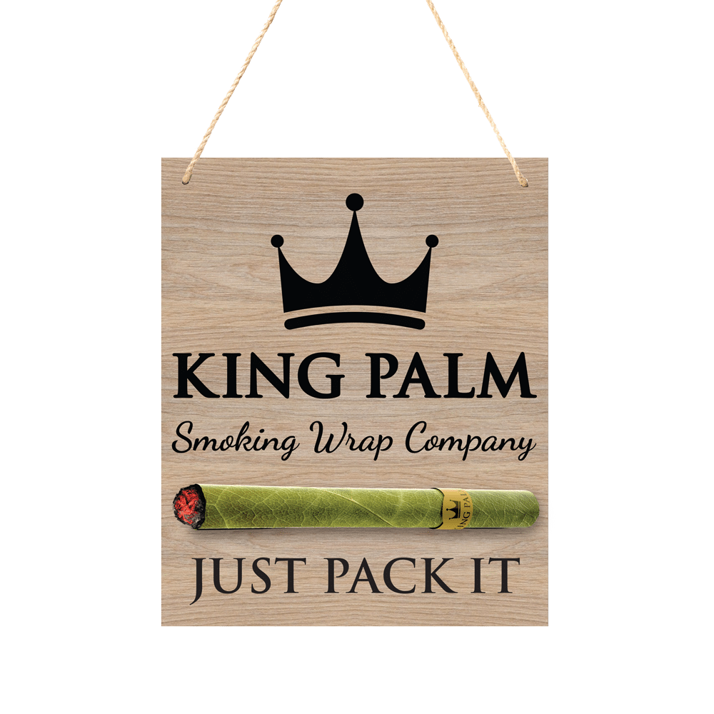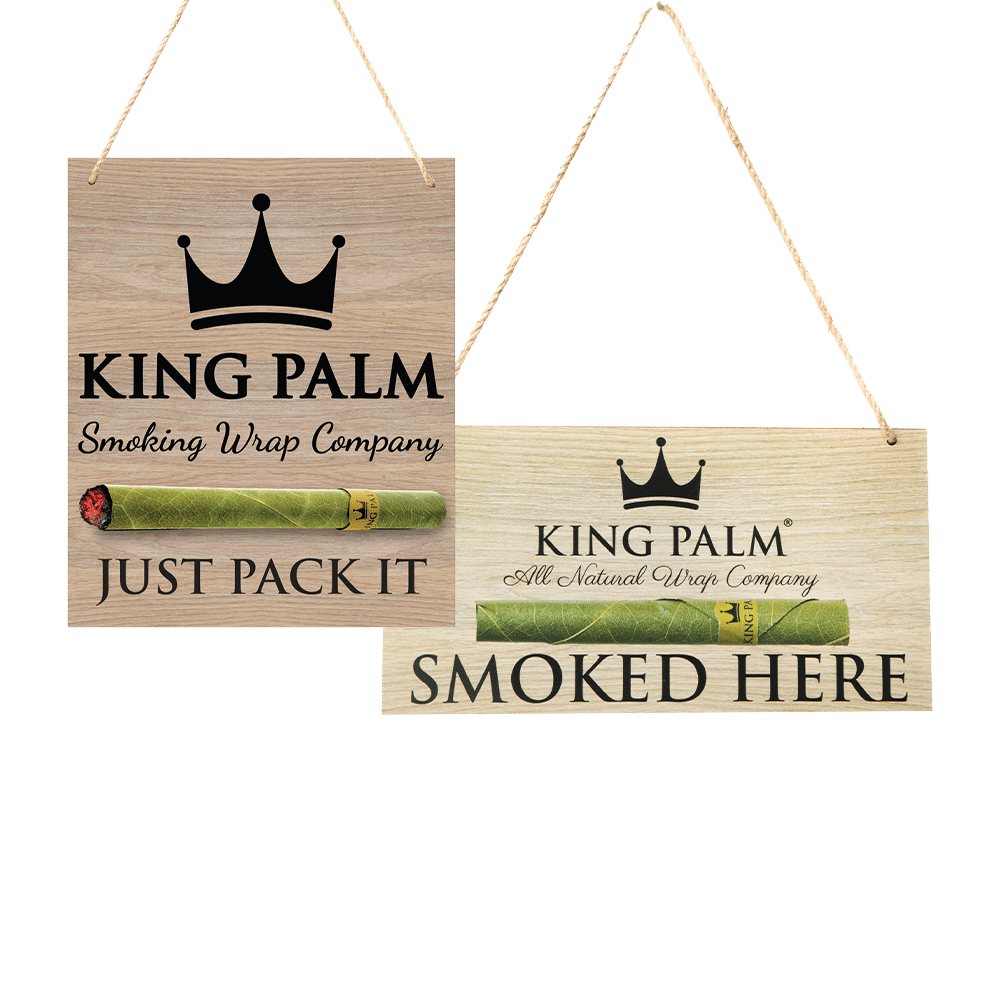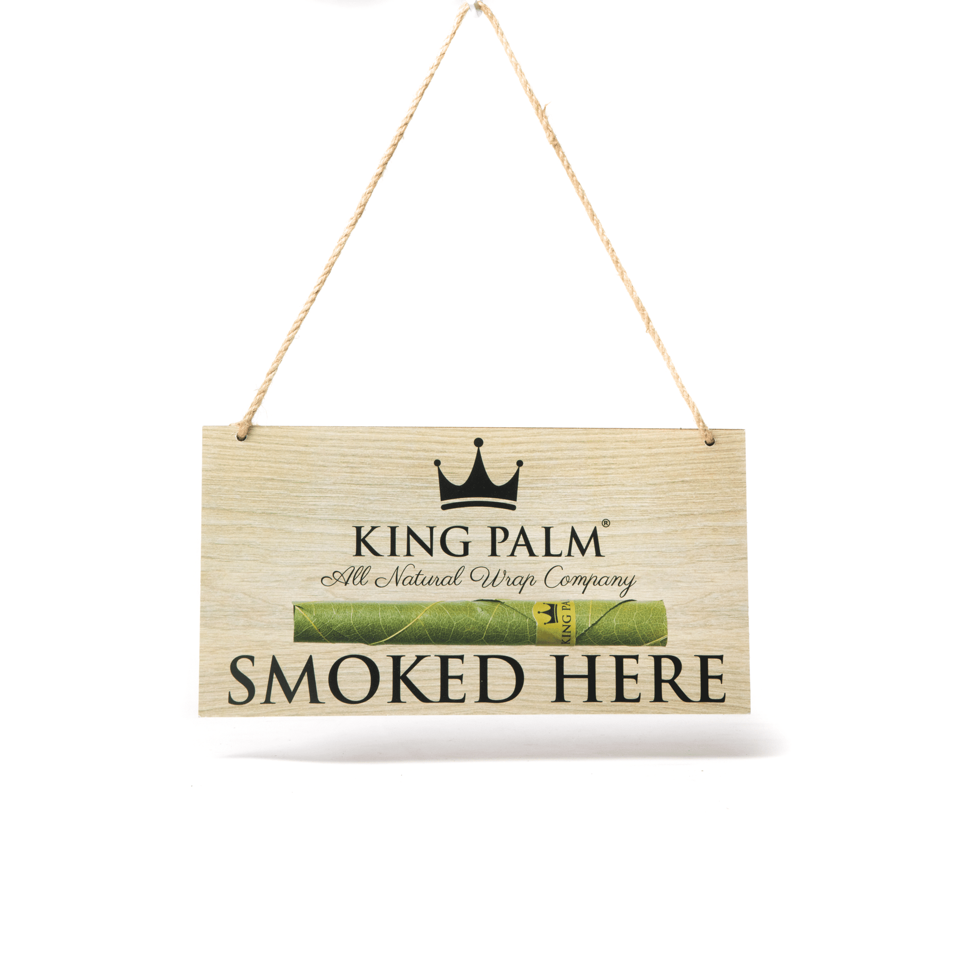 It is time to put up a King Palm Hang Sign at your home or store to let everyone know that King Palm is smoked here. This is a custom wooden sign with a thick rope and powerful design.