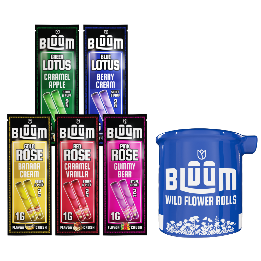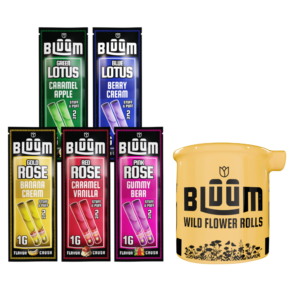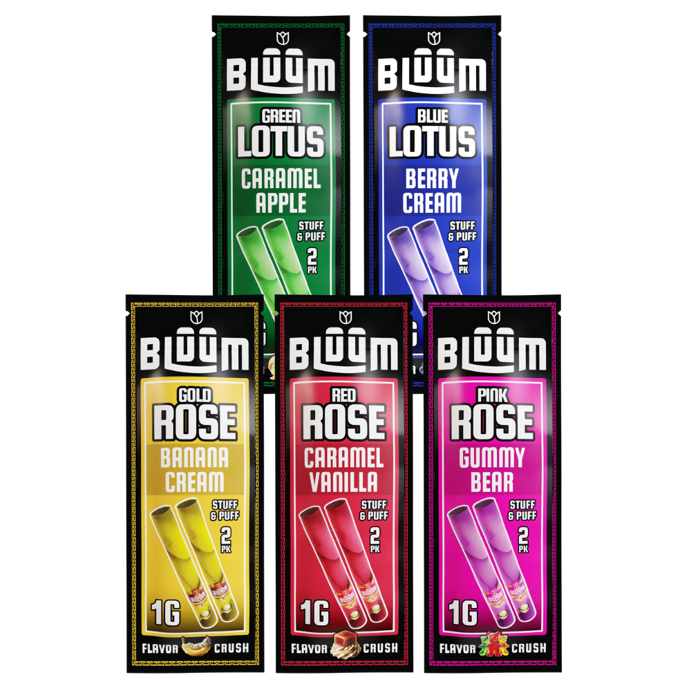 Indulge in Bluum’s all-natural wild flower rolls, crafted with care. Our Rose and Lotus Flavor tubes offer a unique Stuff & Puff experience. Crush the capsule inside the tip to release a burst of flavor with options like Gummy Bear, Banana Cream, Caramel Vanilla, Berry Cream, and Caramel Apple. Try all of our flavors and find your favorite!